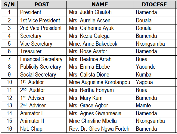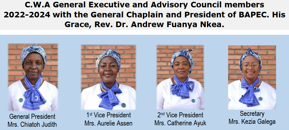The Executive Team of the CWA Cameroon voted into office in July 2021 to July 2024 in the 9th National Congress held in Ngaoundere comprised the following;